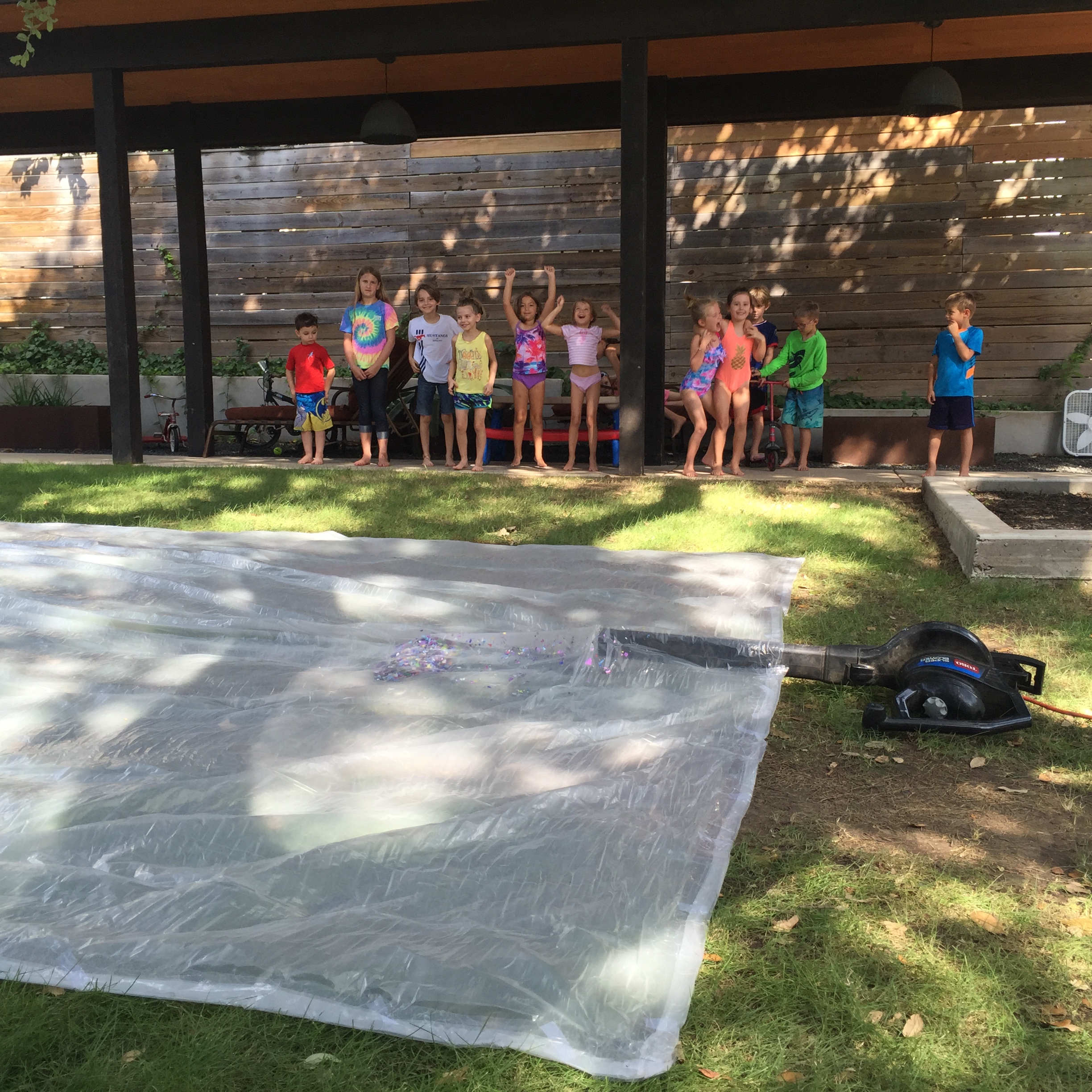 That is when I got out the HUGE plastic bubble cushion that I had prepared earlier that morning and we took it outside. We stretched it out, added some confetti, and blew it up with a leaf blower. The kids were amazed by the size of it! Going BIG always creates a BIG impact with kids. (DIY instructions below.) Then we just played with the space. The kids played under it kicking the confetti around and laughing. Then I asked them if they wanted to get inside of it. This is when they really freaked out! The excitement was as big as our bubble that we had made. I explained to them that we could not get inside of it and close it up because we need air to breathe, but we could open one end and explore it. We attached a 20” box fan to it (a slightly larger box fan would have been better, but that is what I had.) and then cut along the opposite end of our bubble. Good thing I had my assistant Sarah there, as well as all the help from the kids. There were a few times when our bubble almost floated away, but we were a good team and we maintained control! Oh, and once in the air tunnel… we had created a magical world. It felt so clean and airy — pun intended — with the sounds of laughter, excitement and wind! I found that using the leaf blower helped at times through the opening to ensure it was fully filled with air, while Sarah managed the fan. Since I had promised the kids a water day and tricked them with an air day, we filled up those bunches of Color Burst water balloons and had a water balloon fight inside of the air tunnel. This was amazing for the kids, but even more amazing for me, since the cleanup was so easy. At the end of the day I just rolled up all of the plastic filled with confetti, water, and water balloon debris and recycled it.