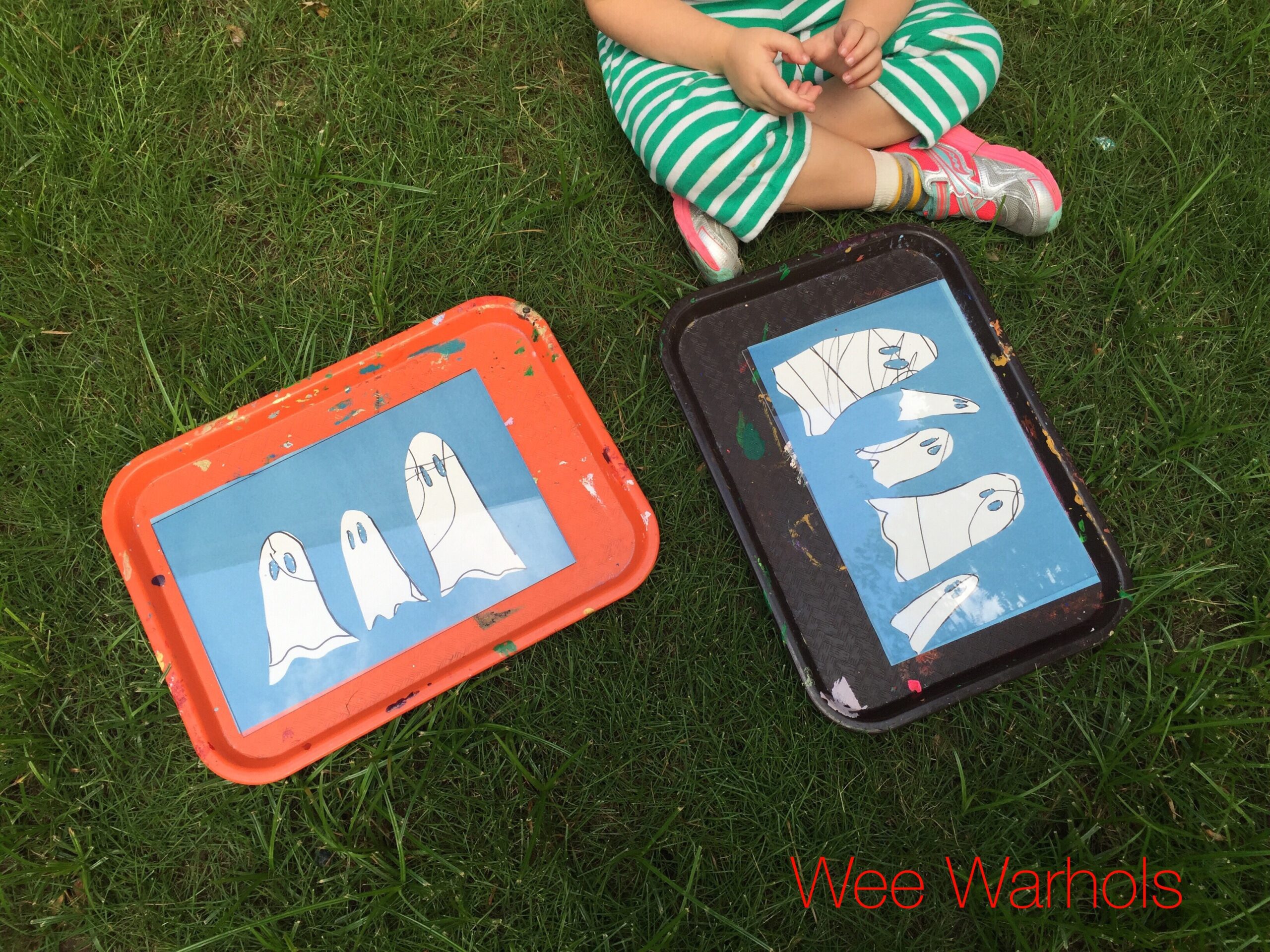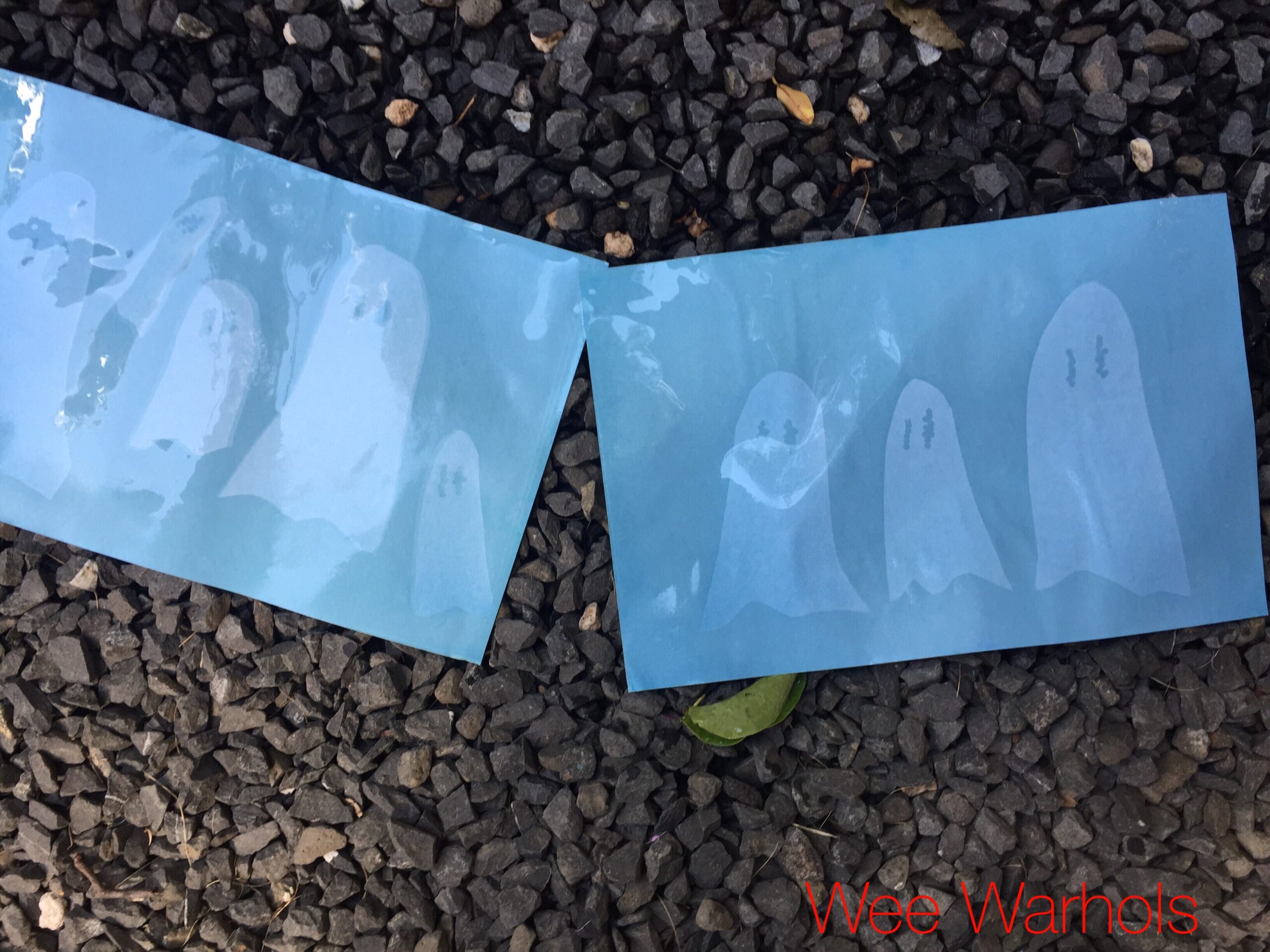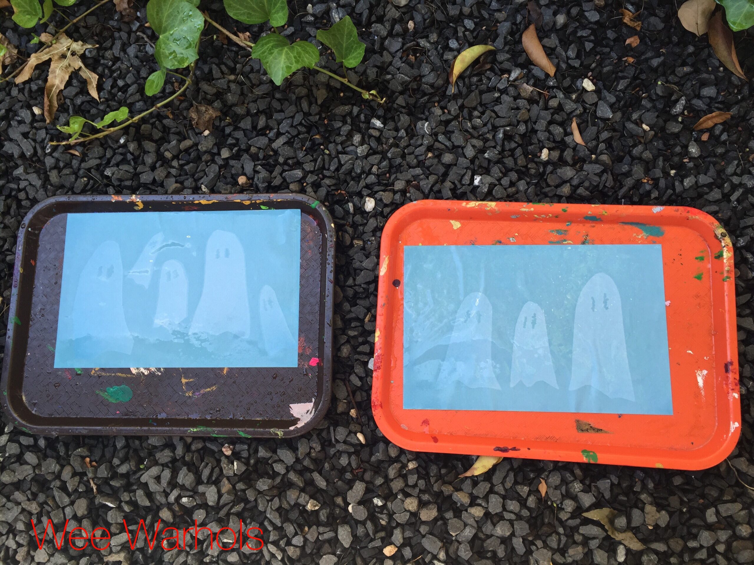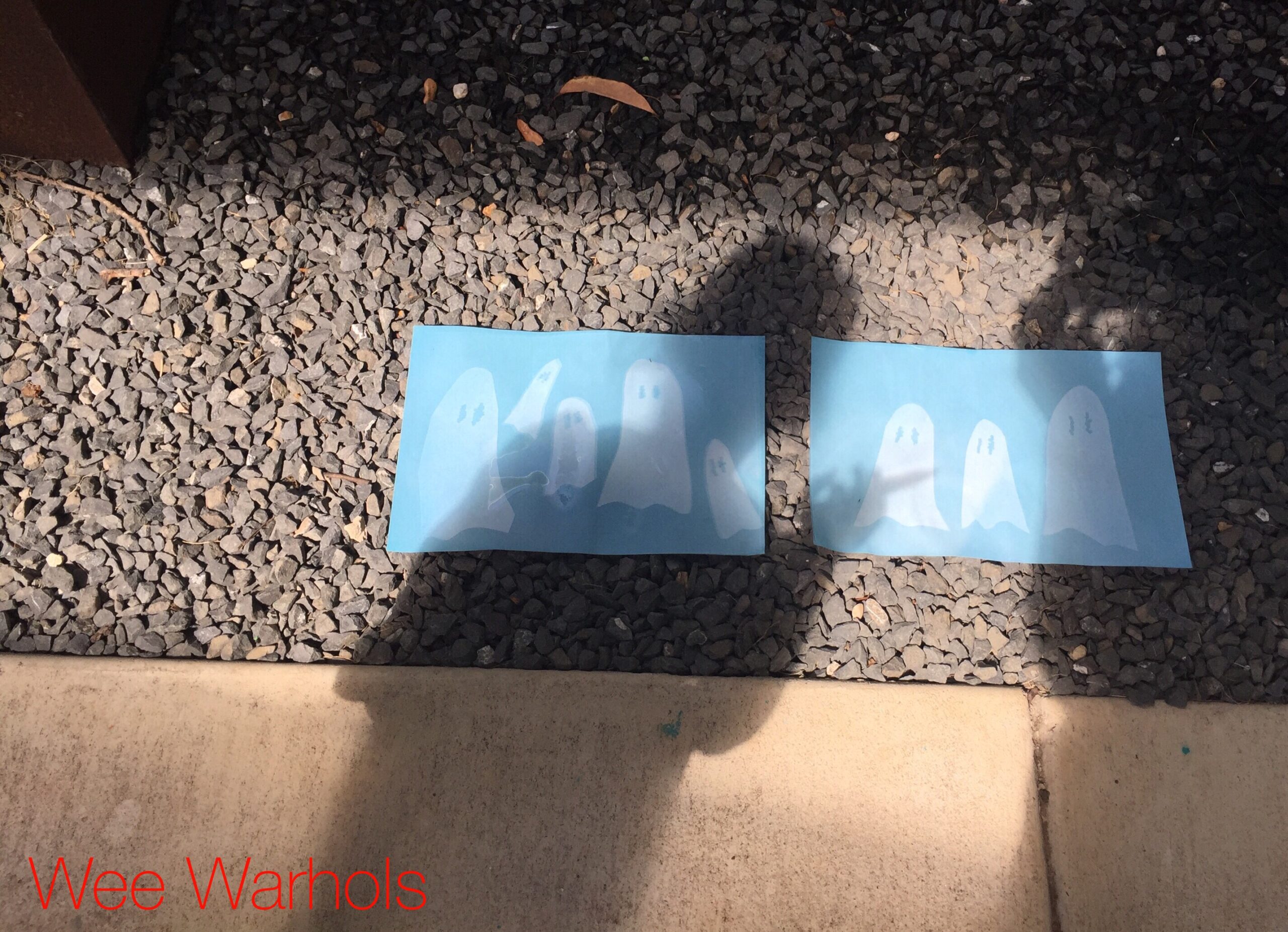When the temperature lows start to get down to 98 here in Austin Texas, I know Fall has arrived. I welcome it with a cup of pumpkin spiced something or other and get totally focused on Halloween and everything that comes a long with it. Decorations, costumes, and Halloween crafts. Today I had a super small class of one, yes that is correct. Things move slow after the busy summer season here at Wee Warhols. M and I hung out and had a fabulous time. I suggested we make something Halloween-ish. She said, ” Sure, but nothing too scary.” I said, “What about Halloween ghost sun prints?” Even though we didn’t have very much sun. She was very interested to find out what a sun print was. I explained to her that we use sun paper to make the prints and it was an alternative process…. Then I said,” We can just try it and you will see what I mean.” We drew a bunch of ghosts on scrap paper and cut them out. I didn’t know how we were going to cut the eye holes out. M had the brilliant idea of using a hole punch and just popping out a circle of holes. Brilliant!