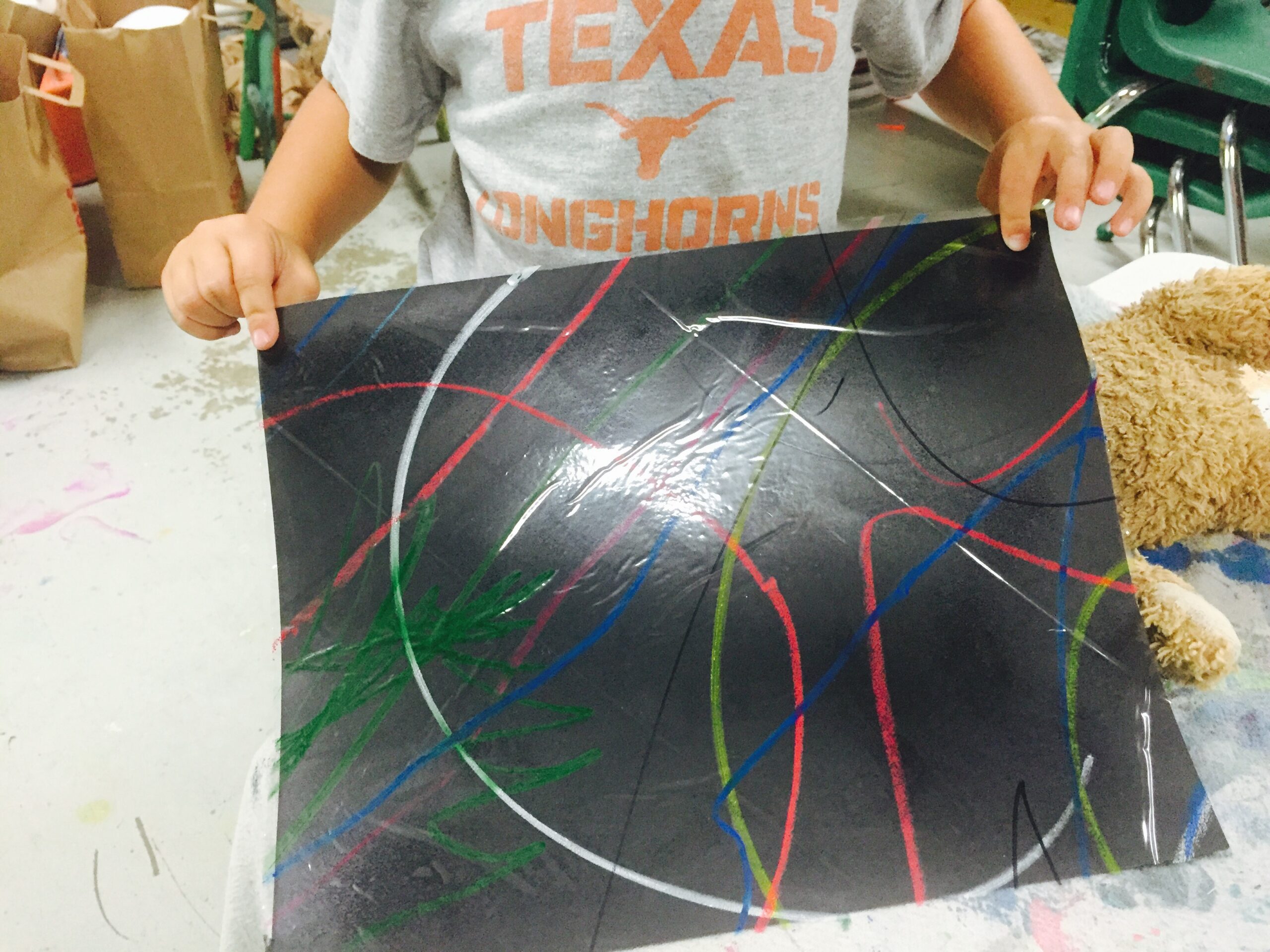 The next day in Wee Warhols art class we had more fun with transparent paper. I taped a large strip of clear acrylic down on the tables. I gave the kids Crayola Slick Stix (oil pastels) to freely draw to the music we were playing.