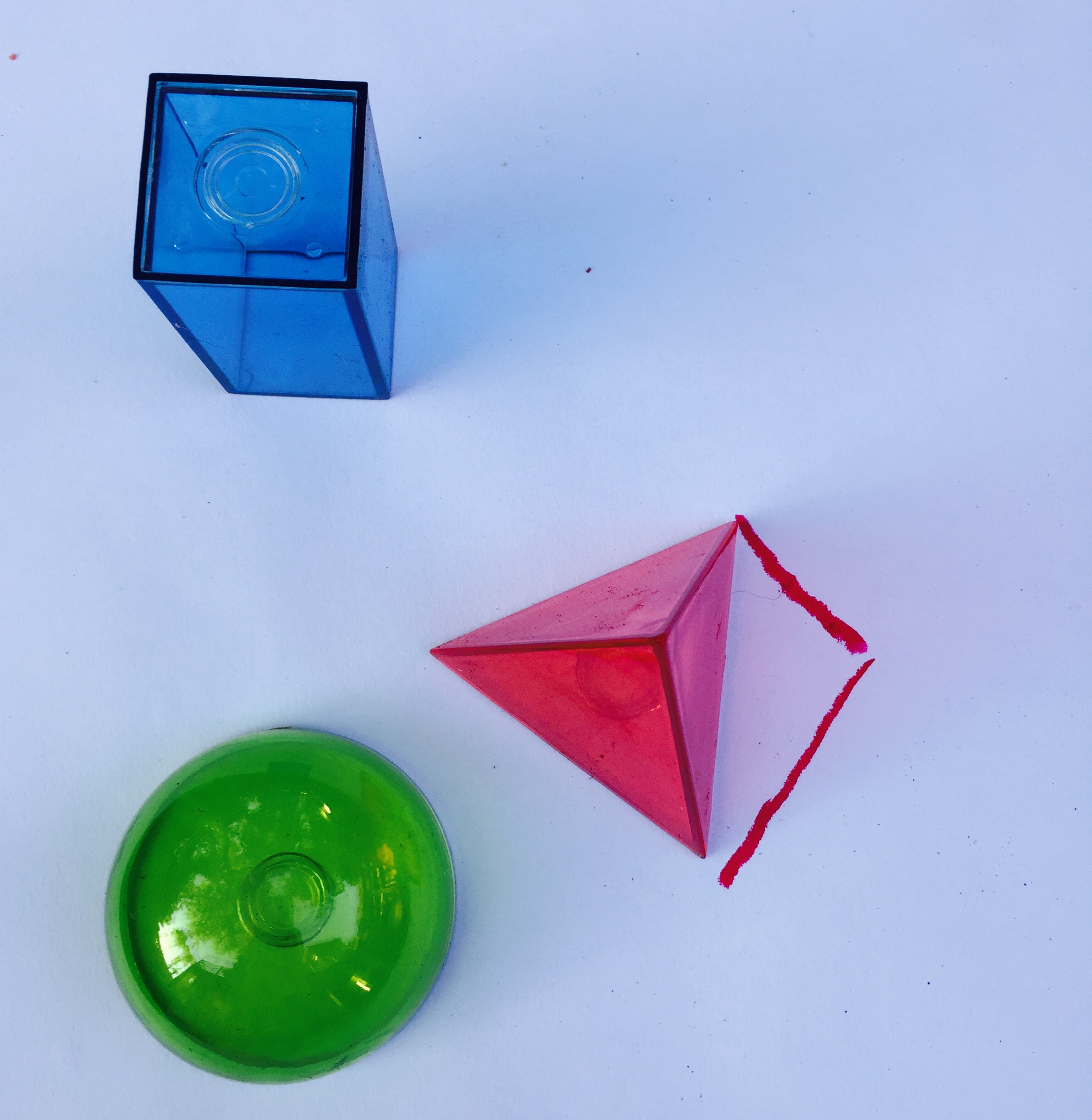 I decided we should get out some Geometric Solids and explore what happened when the light passed through them. We placed them out on the paper. M traced the colored light that was created.