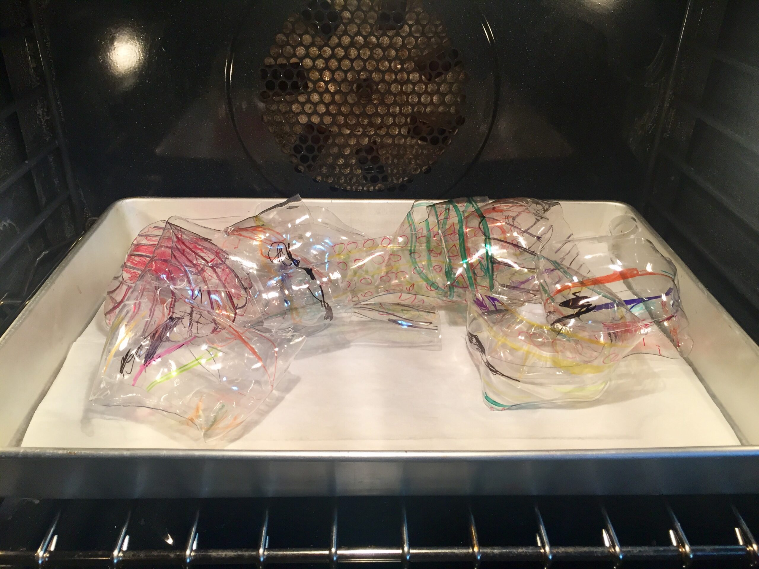 6. Place sculpture in oven for only a few minutes.  Watch while the plastic shrinks and tightens around each other.  It will only shrink so much, since the plastic is much thicker than Shrinky Dink paper. (Be very careful when using a hot oven.  There should always be a grown up present when melting anything in an oven.)