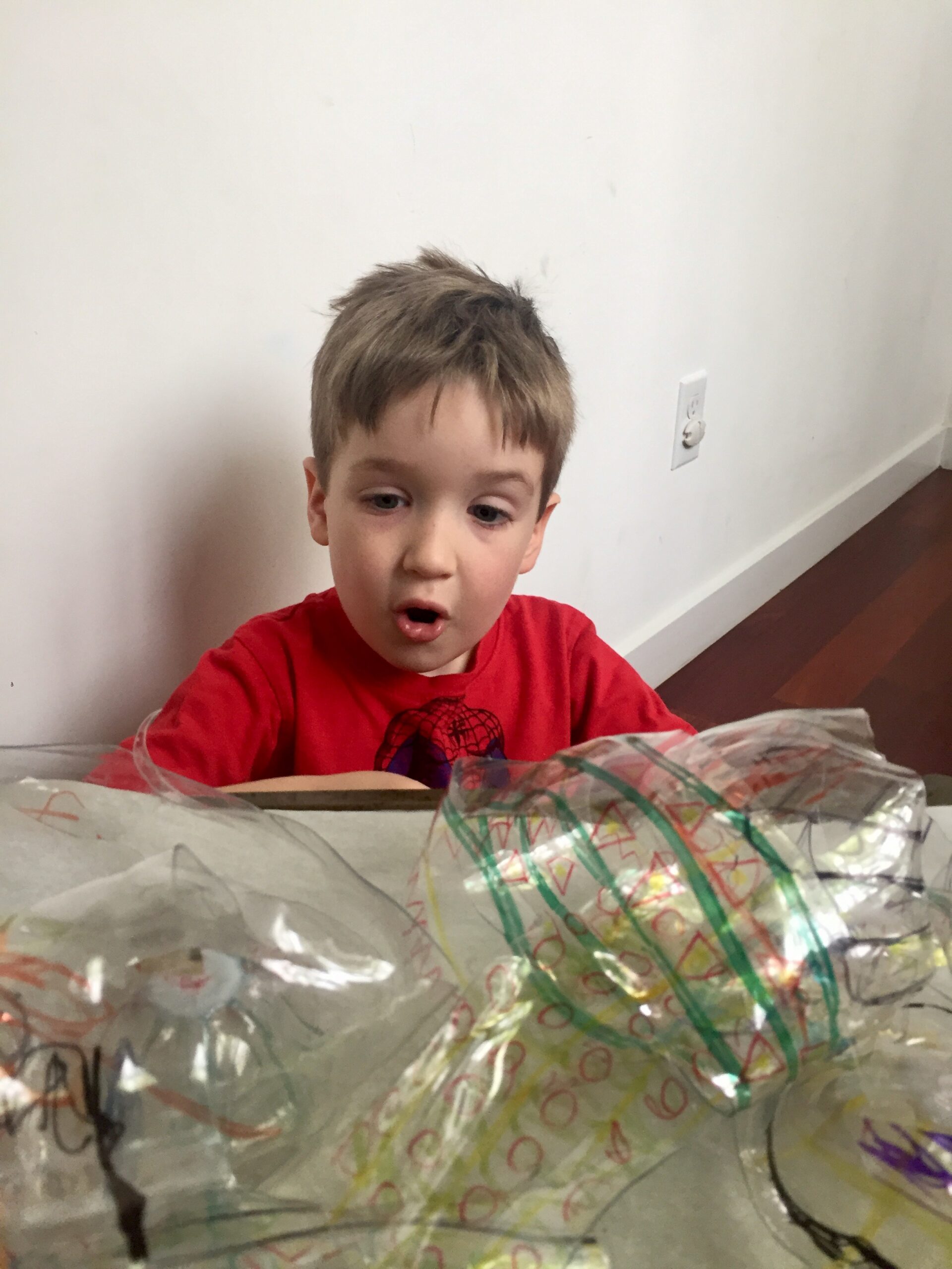 I would usually say work big then cut down.  For example, have the kids draw on the whole bottle, then cut it up.  But, I found that kids become attached with what they have created and they will not want you to cut it up, to continue on to the next step.  So, cut it up first into spirals or random pieces that can be intertwined, then give them to the kids to color.  I didn’t find the cut plastic to be a danger.  Just keep a close eye on them and make sure no one is throwing the pieces around.