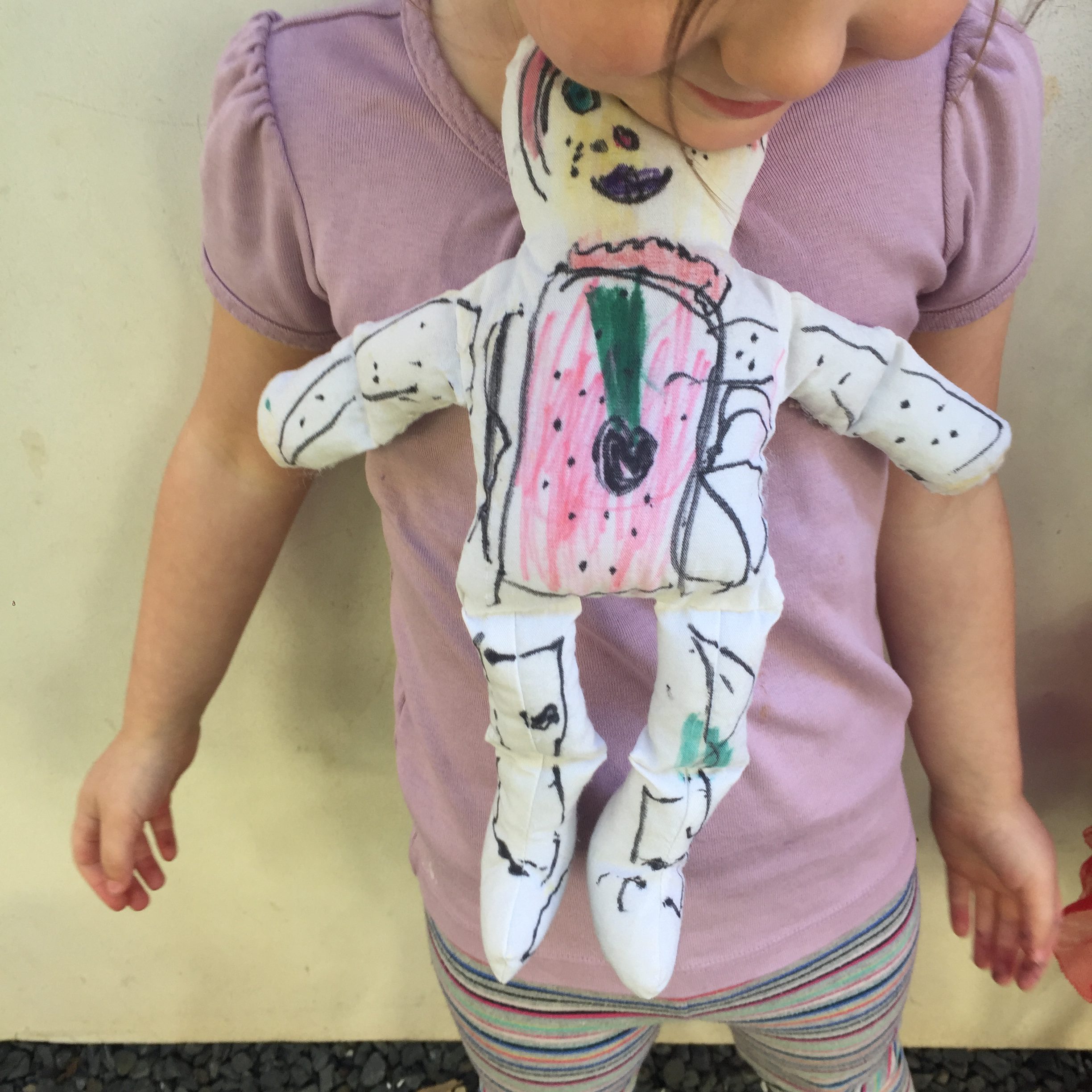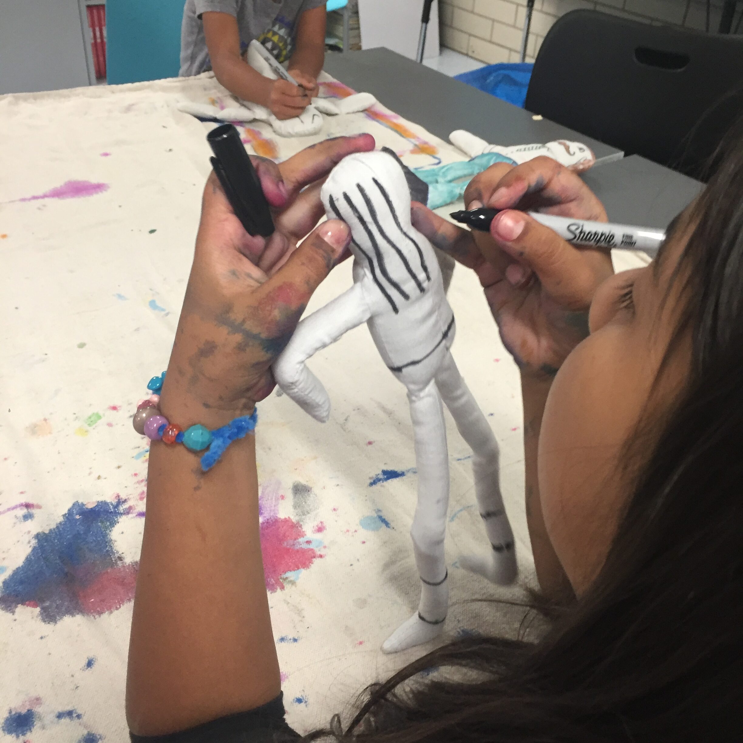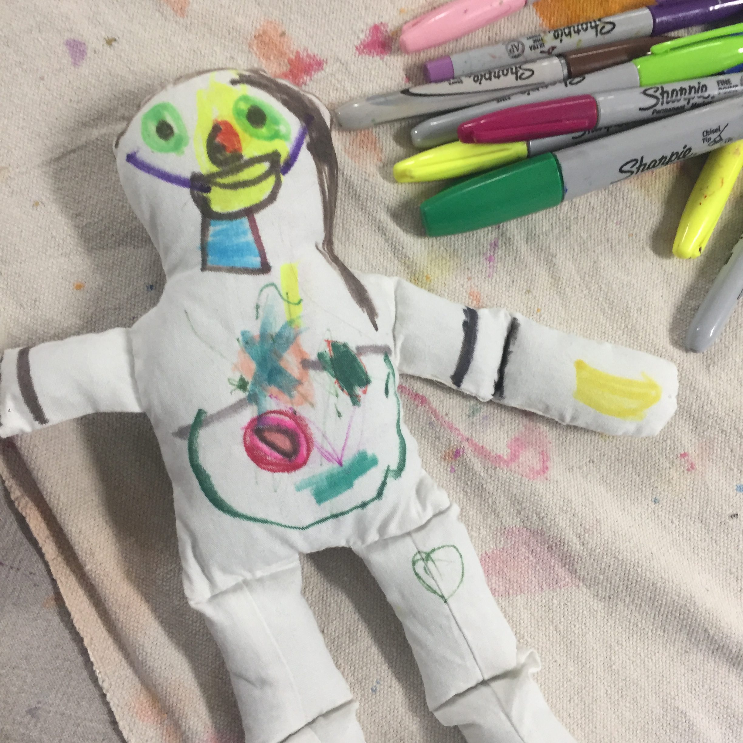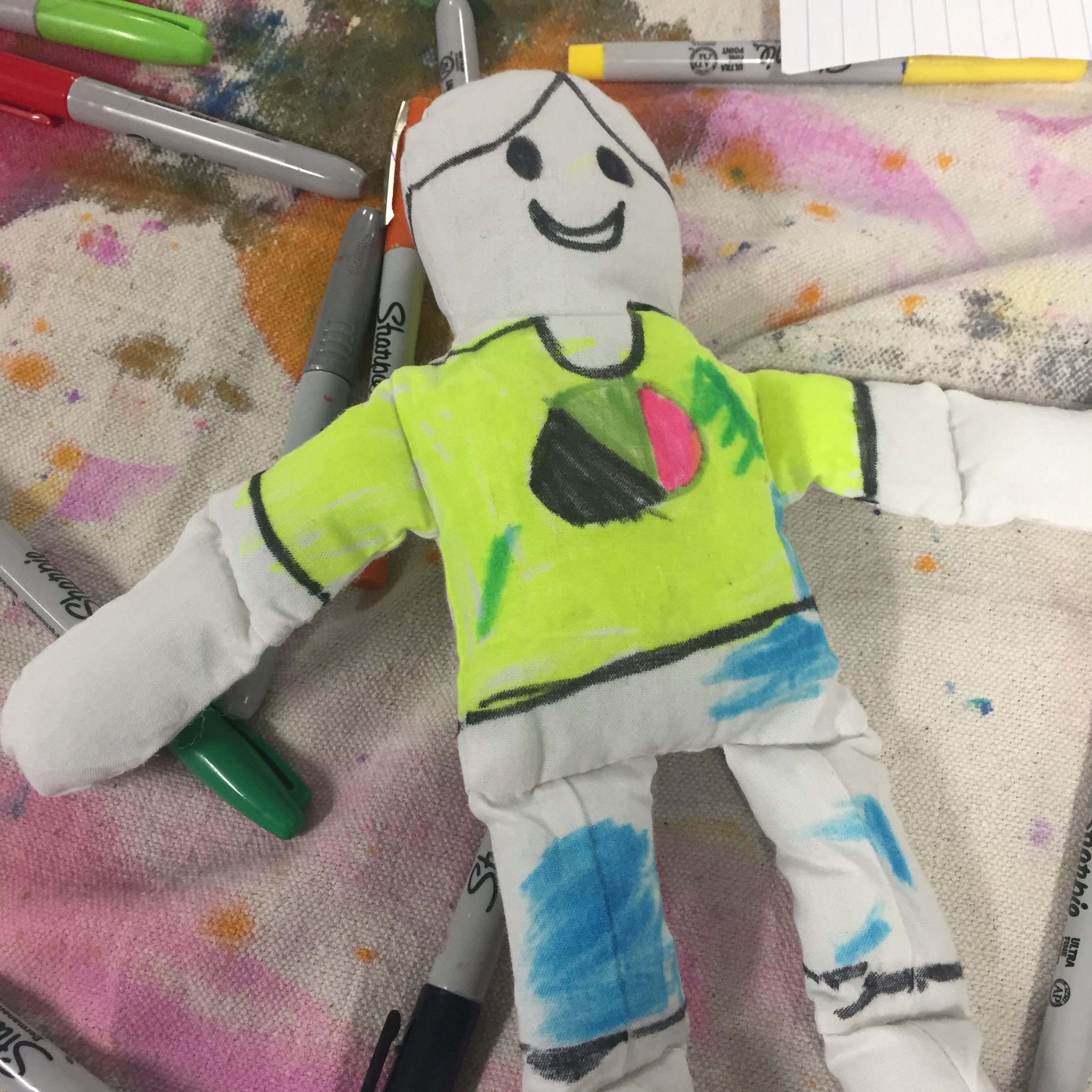 I always start out by having the kids pick their doll. Then I give them each a black Sharpie marker to draw everything out. What is so great about this is there is no right or wrong. It is their own doll and they can make it a girl or a boy, have long hair or short… It is whatever they make it.