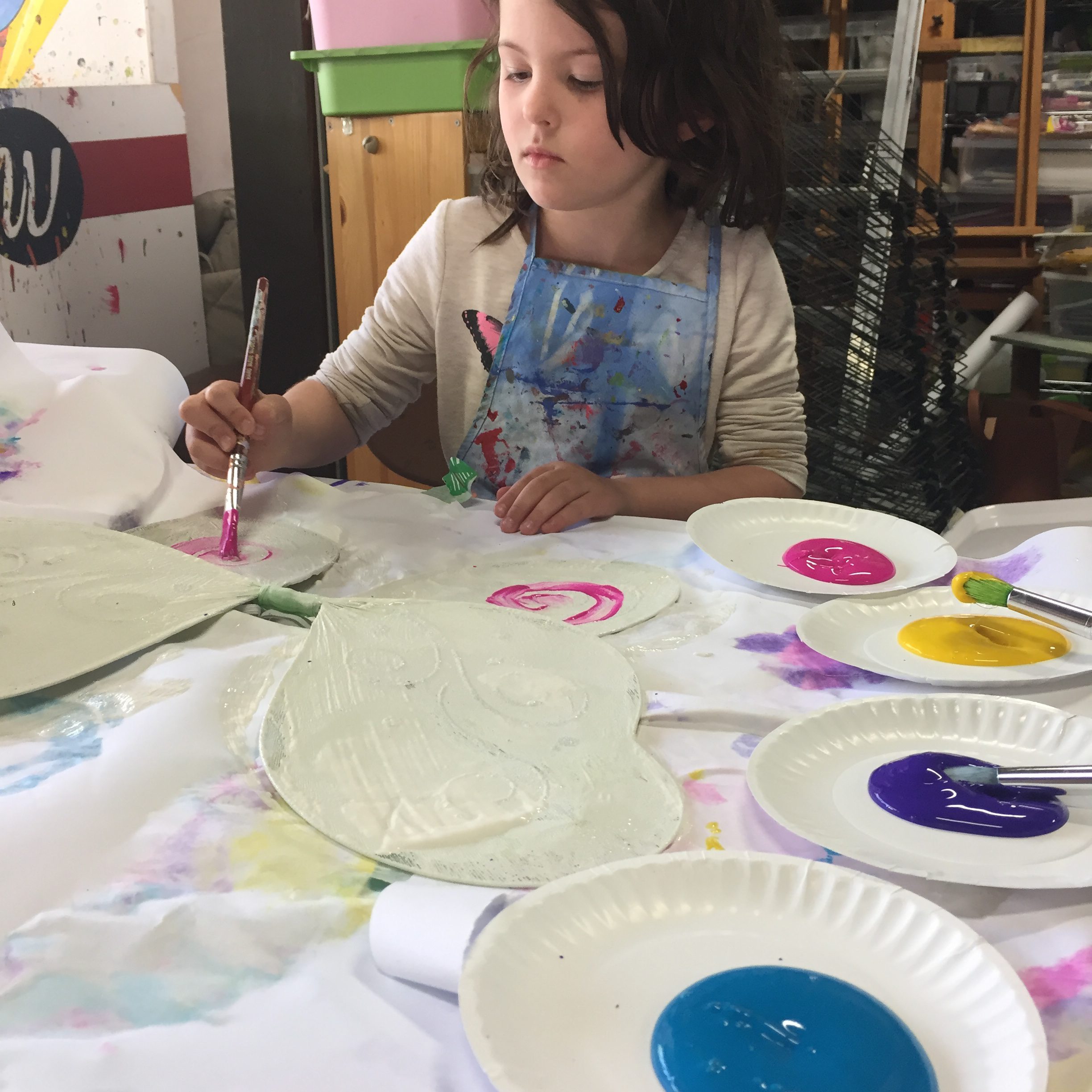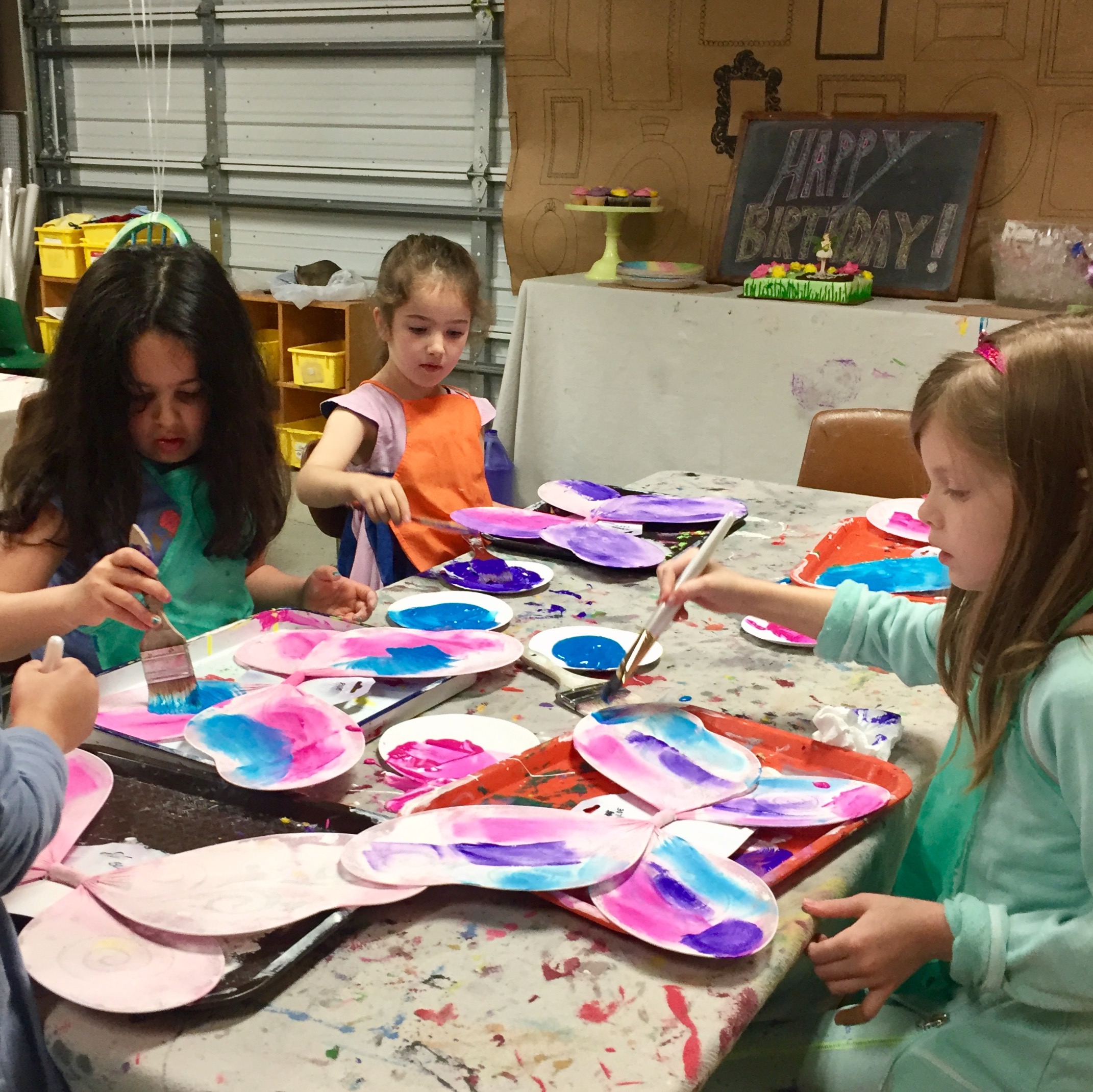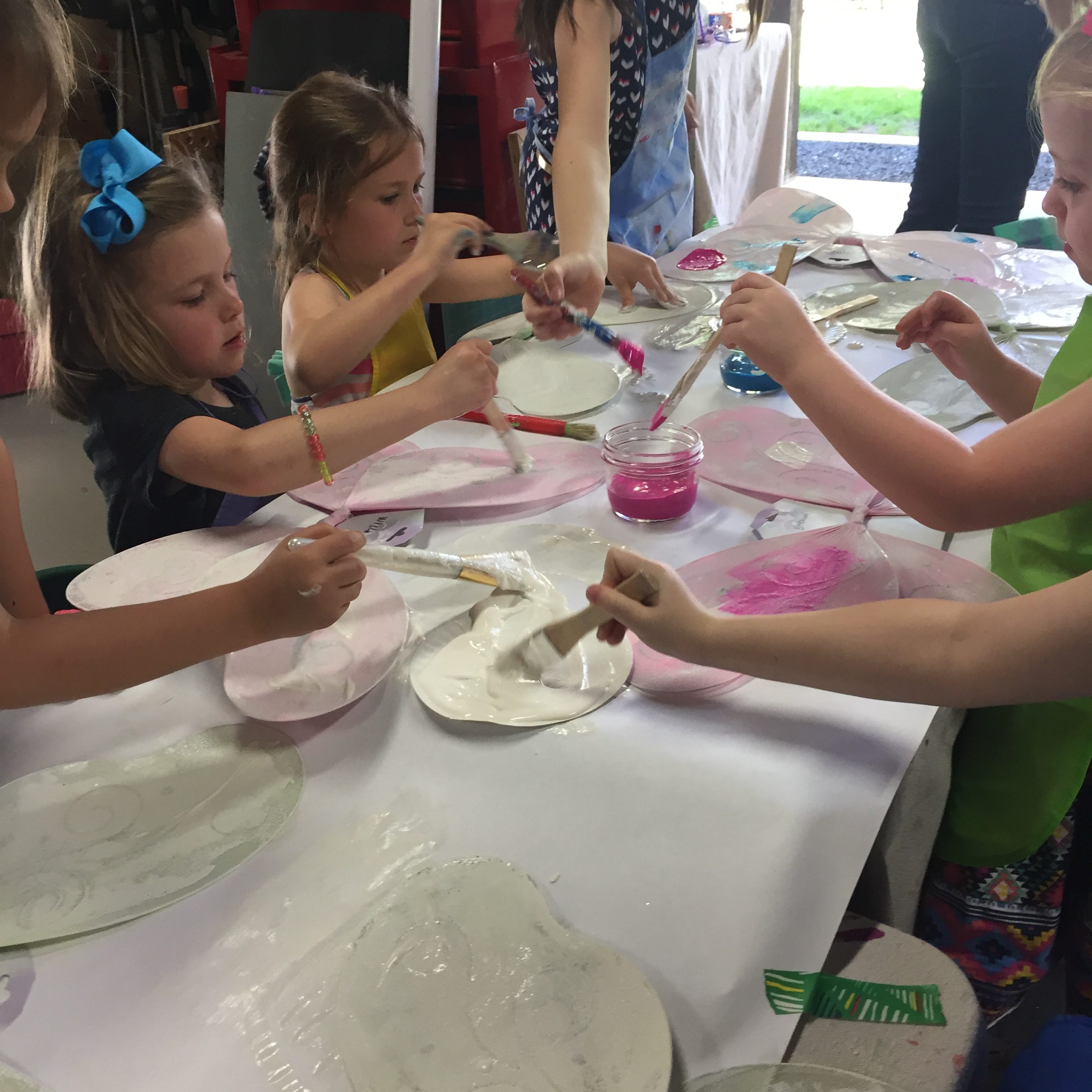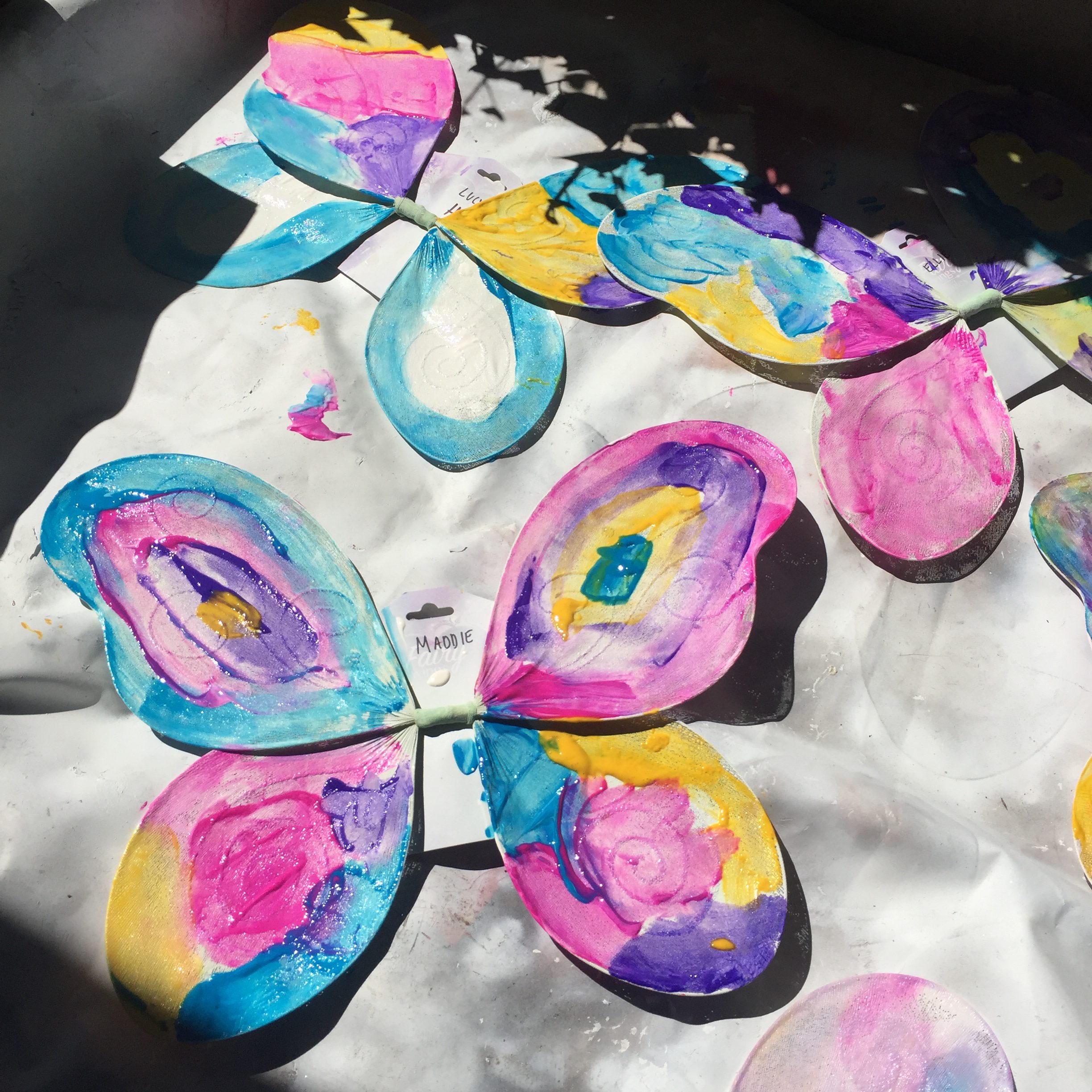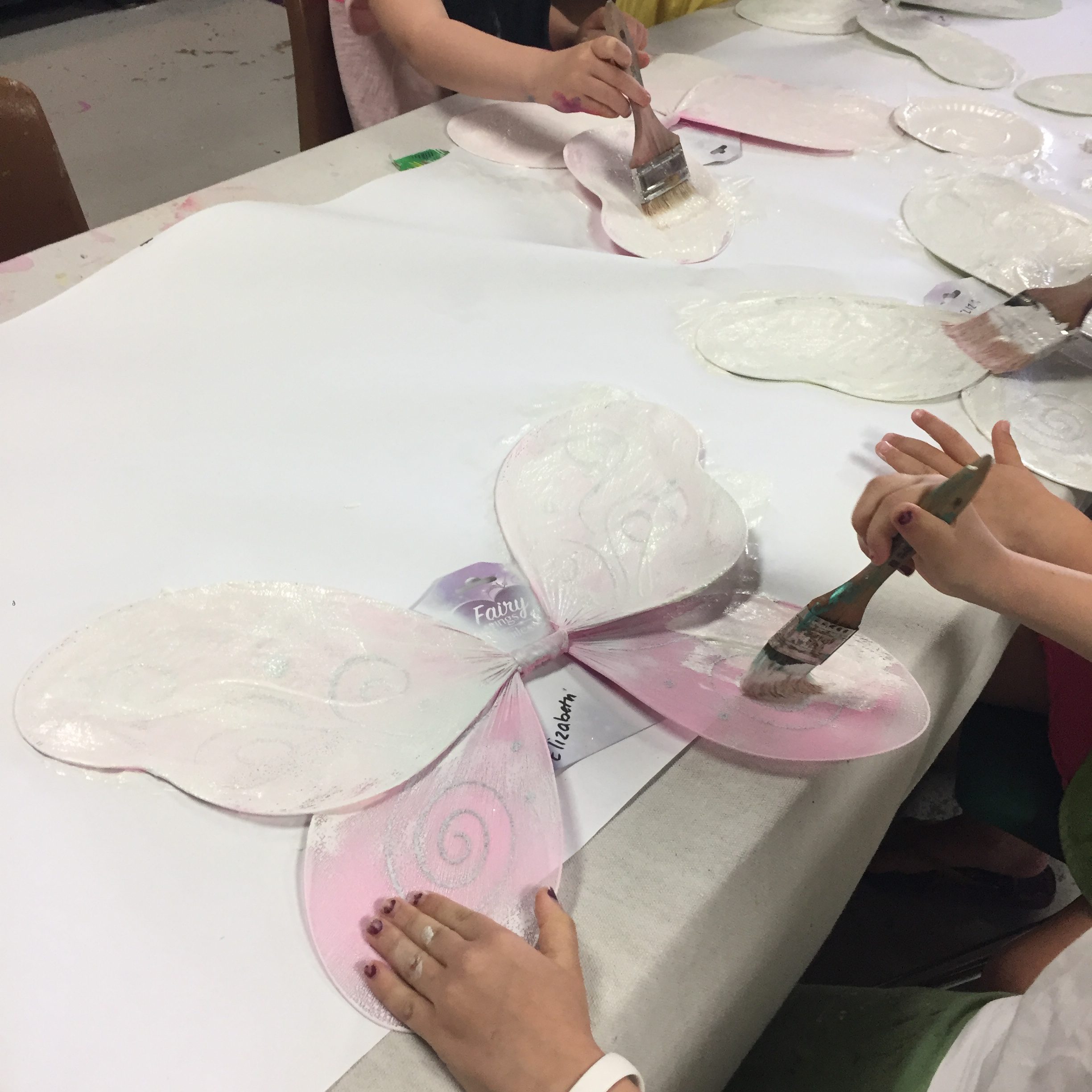 - I placed an extra layer of paper down on the table since the paint will seep through. You could also use trays. Each child started out by painting their primed wings with white tempera paint for the base.